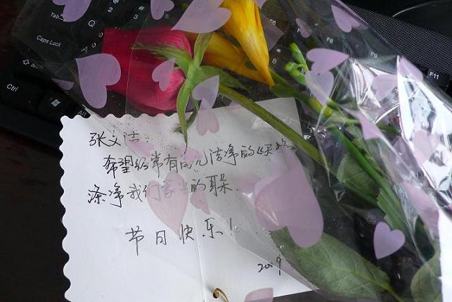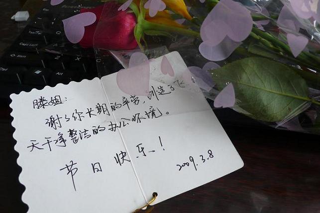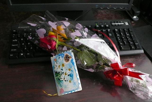 3月6日,星期五的早上,向往常一樣,很早就來到了單位,進到辦公室后,一股玫瑰的清香味撲鼻而來,走進一看,才發(fā)現(xiàn)兩張辦公桌了靜靜地“躺”著兩朵嬌艷的玫瑰花和兩張精致的賀卡。
