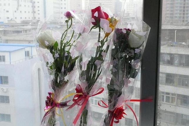 玫瑰紅得艷麗,花瓣上凝著水珠,蕊兒嬌媚羞澀,朵朵葉葉緊密擁抱在一起流淌著濃郁的香氣。彩色的絲帶長長彎曲,好像少女的一縷頭發(fā),俏麗著青春。初春蘭州仍然寒冷,可房間里的玫瑰卻沁人心脾。