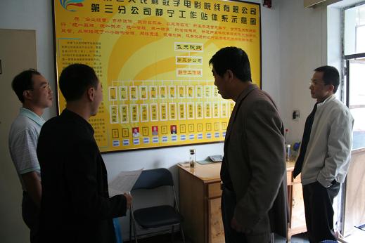 2009年9月17日,靜寧縣廣播電影電視局張前江局長在甘肅飛天院線第三分公司經(jīng)理夏海濤陪同下參觀指導(dǎo)靜寧縣農(nóng)村數(shù)字電影放映工作,在參觀指導(dǎo)過程中,張局長親自調(diào)試數(shù)字放影機(jī),了解如何下載影片、放映影片等。