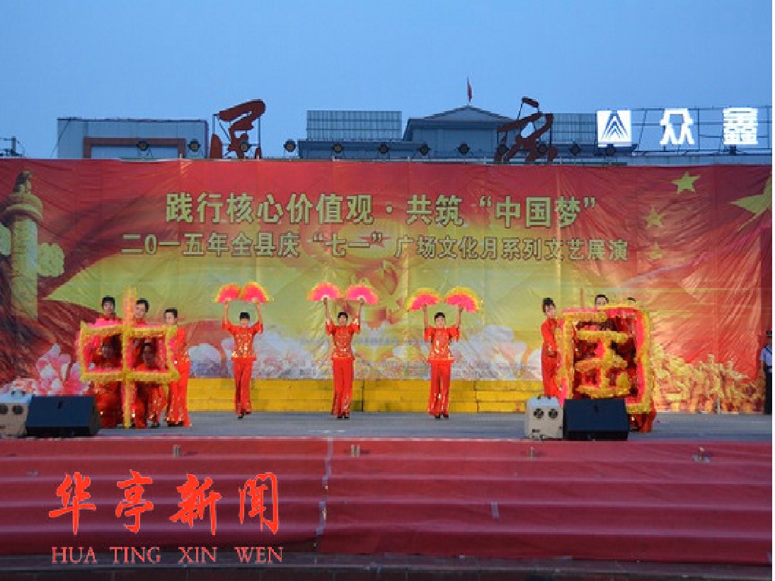 華亭縣2015年慶“七一”踐行核心價(jià)值觀、共筑我們的“中國(guó)夢(mèng)”廣場(chǎng)文化月系列文藝展演活動(dòng)在縣人民廣場(chǎng)隆重舉行,本次活動(dòng)由中共華亭縣委組織部、縣委宣傳部主辦、縣總工會(huì)、縣文體廣電局組織實(shí)施,各鄉(xiāng)鎮(zhèn)人民政府、東華街道辦事處、工業(yè)園區(qū)等33個(gè)單位承辦,13個(gè)文藝團(tuán)體參演本次展演活動(dòng)。