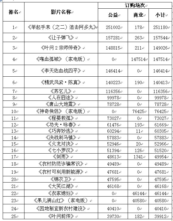 從表四看,江西欣榮院線去年排名第二名,今年躍升至榜首;而去年同期排在榜首的是北京奔小康院線,今年,已經(jīng)跌出前十;公益院線前十名中進步最大的是滄州春雨院線,從去年的第27名直接升到第8名;甘肅飛天院線和四川新天地院線較去年同期訂購場次略有減少,名次也從去年的第3名和第4名分別后移至第4名和第6名。