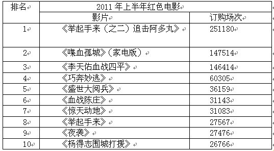 今年是建黨90周年,為配合院線放映活動的開展,電影數(shù)字中心推出大型專題《“紅五月”百部紅色影片推薦》和《建黨90周年60部優(yōu)秀影片推薦》專題,共推薦影片80余部,總訂購場次超過百萬場。像《舉起手來(之二)追擊阿多丸》(25萬1180場)、《喋血孤城》(14萬7514場)、《李天佑血戰(zhàn)四平》(14萬6414場)等都取得了10萬場以上的訂購成績,此次選擇的紅色影片包括:一、抗日題材影片,如《舉起手來(之二)追擊阿多丸》、《巧奔妙逃》、《血戰(zhàn)陳莊》等;二、解放戰(zhàn)爭題材影片,如《李天佑血戰(zhàn)四平》、《楊得志圍城打援》等;三、新時代軍人題材影片《殲十出擊》、《驚天動地》等;四、英模人物題材影片,如《賀龍軍長》、《焦裕祿》等。過百萬場的訂購成績說明“紅色影片”在農村廣受歡迎。