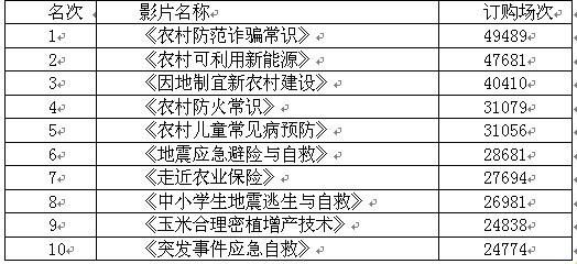 三、人身健康安全方面的影片引起關注,如《農村防火知識》、《農村兒童常見病預防》、《中小學生地震逃生與自救》,表明農民群眾在關注生產生活之外,同樣關注個人健康人身安全。