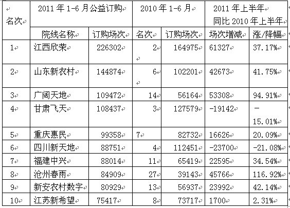 2011年上半年,進入全國公益訂購前十名的院線有六條院線在2010年排在前十名,有四條新院線進入前十,分別是廣闊天地院線、福建中興院線、滄州春雨院線和新安農村數(shù)字院線(見表四)