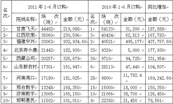 從表五看,前三名的院線中甘肅飛天院線蟬聯(lián)榜首,江西欣榮院線從去年的第三名升至第二名,而福建中興院線則下跌一位,排在第三名;雖然今年上半年的訂購場次較去年上半年有所下降,但是前十名中無一例外訂購金額全部實現(xiàn)正增長,其中福建中興院線訂購金額達到了932,934.60元,比去年多了437,757.60元;北京奔小康院線和西藏電影公司從去年上半年的30名左右,上升至第4名和第5名。