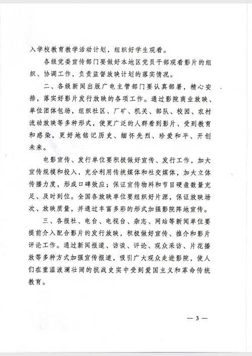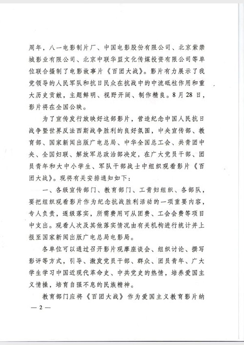 中央宣傳部辦公廳等關(guān)于組織觀看電影《百團大戰(zhàn)》的通知