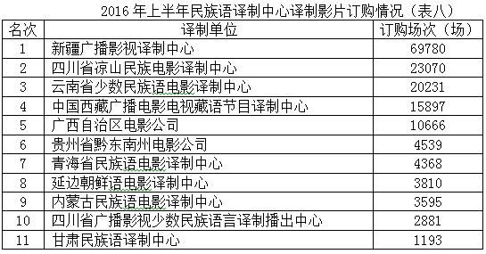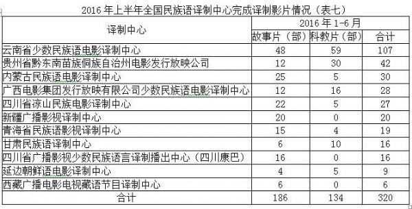 據(jù)統(tǒng)計(jì),2016年1-6月少數(shù)民族語(yǔ)有可供譯制影片60部,譯制申請(qǐng)影片510部次,譯制完成影片320部次,發(fā)行版完成影片595部次;總計(jì)訂購(gòu)少數(shù)民族語(yǔ)發(fā)行版影片160030場(chǎng),較2015年同期增加9893場(chǎng),增幅為6.59%。目前,全國(guó)共有11個(gè)譯制中心,可譯制素材累計(jì)已達(dá)745部,累計(jì)完成譯制片4711部次,包含了17個(gè)語(yǔ)種的38種方言,其中新增“壯語(yǔ)-廣西-崇左”、“瑤語(yǔ)-廣西-南丹”、“瑤語(yǔ)-廣西-金秀”3種方言。