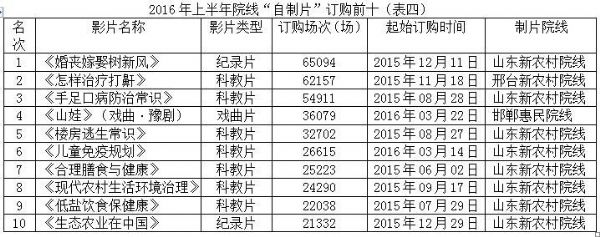 就2016年上半年訂購(gòu)情況來(lái)看,“院線自制片”中最成功的當(dāng)屬科教片,排名靠前的多為院線結(jié)合本區(qū)域農(nóng)民實(shí)際需求制作的科技含量高、實(shí)用性強(qiáng)的科教片,如《手足口病防治常識(shí)》、《現(xiàn)代農(nóng)村生活環(huán)境治理》等。
