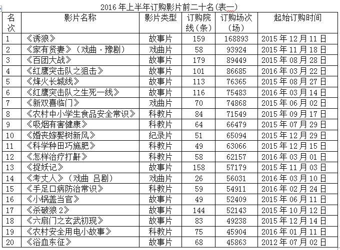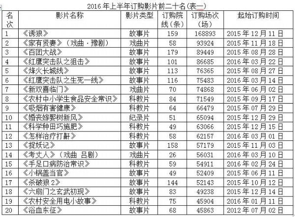 從影片出品時(shí)間到影片登陸平臺(tái)時(shí)間,基本保證農(nóng)民觀眾第一時(shí)間看到“新片”,同時(shí)各地院線也采取響應(yīng)措施,保證訂購(gòu)的國(guó)產(chǎn)新片(院線上映不超過(guò)2年)比例不少于1/3。2016年上半年訂購(gòu)前20名的影片(見(jiàn)表一)中幾乎全部為一年內(nèi)登陸平臺(tái)的影片。