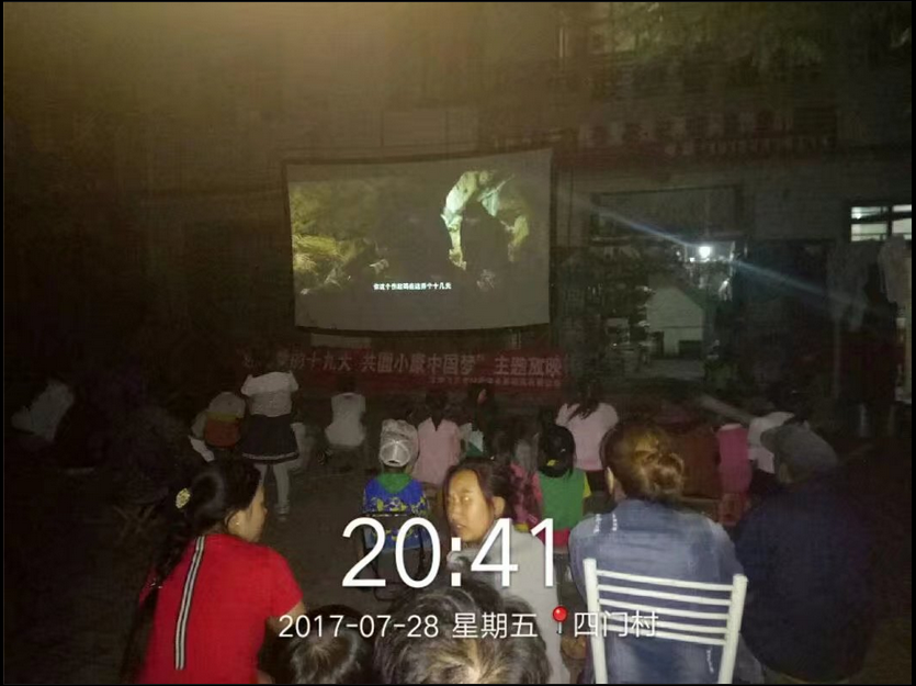 在公司的統(tǒng)籌安排下,武山放映隊(duì)積極響應(yīng)"迎接黨的十九大、共圓小康中國(guó)夢(mèng)"主題放映活動(dòng)。放映員在放映前拉起了橫幅,為觀眾送上《中國(guó)夢(mèng)》等一系列公益廣告,為黨的十九大的順利召開(kāi)營(yíng)造出良好的農(nóng)村電影文化氛圍。對(duì)此,大家滿懷信心,扎實(shí)做好喜迎黨的十九大宣傳工作。