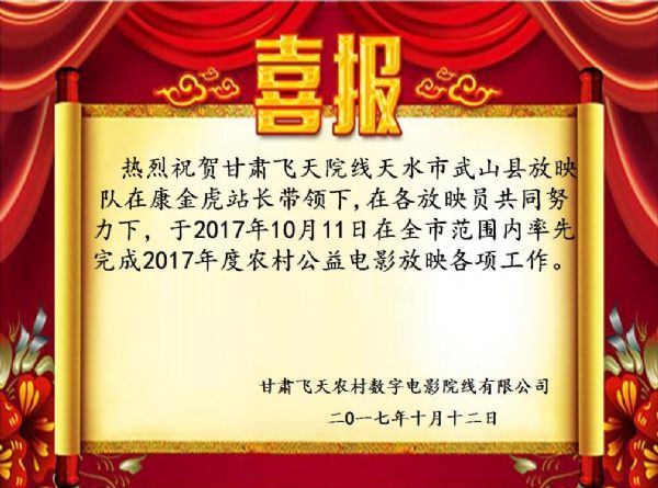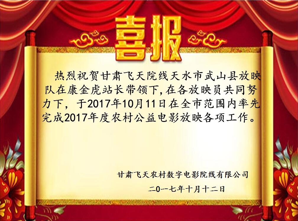 截止到2017年10月11日,甘肅飛天農(nóng)村數(shù)字電影院線有限公司第六工作站武山放映隊(duì)在康金虎站長(zhǎng)的帶領(lǐng)下, 率先完成2017年度全年農(nóng)村公益電影放映任務(wù)。