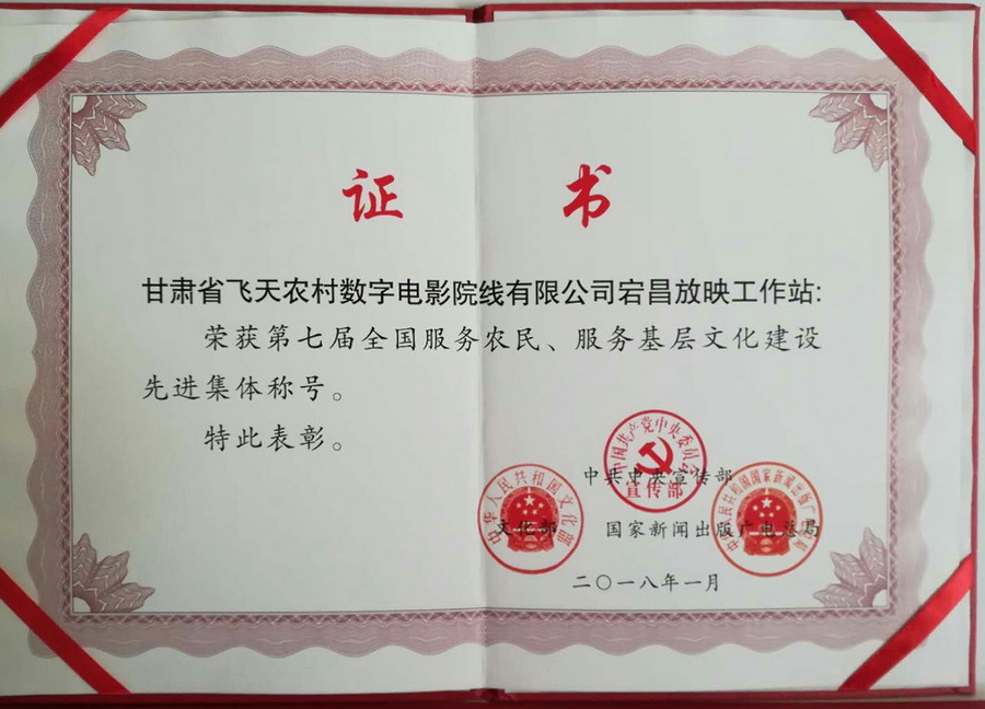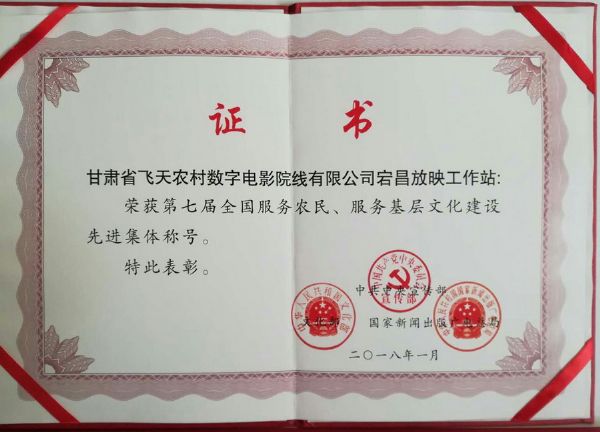 我省隴南市宕昌縣及張掖市民樂縣電影放映隊(duì),在2018年1月分別被中共中央宣傳部、文化部、國(guó)家新聞廣電總局評(píng)為“第七屆全國(guó)服務(wù)農(nóng)民、服務(wù)基層文化建設(shè)先進(jìn)集體”榮譽(yù)稱號(hào)。
