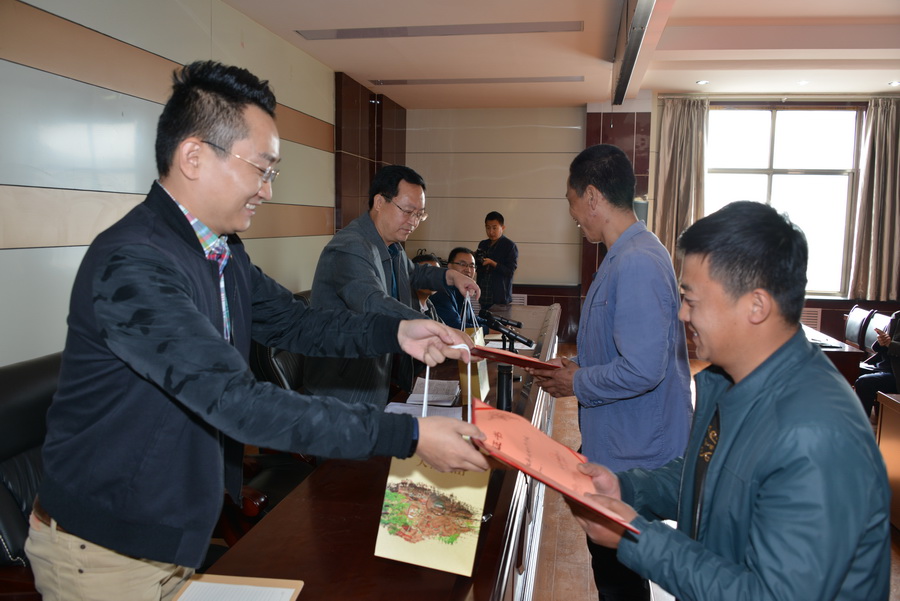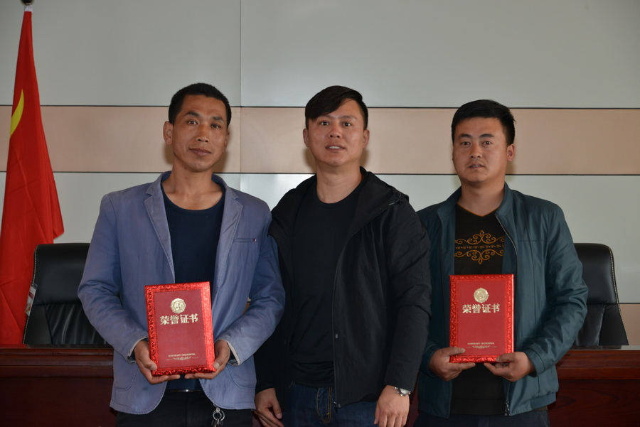 武山地區(qū)優(yōu)秀放映員張成祥、馬文弟與第六工作站負(fù)責(zé)人胡超杰合影