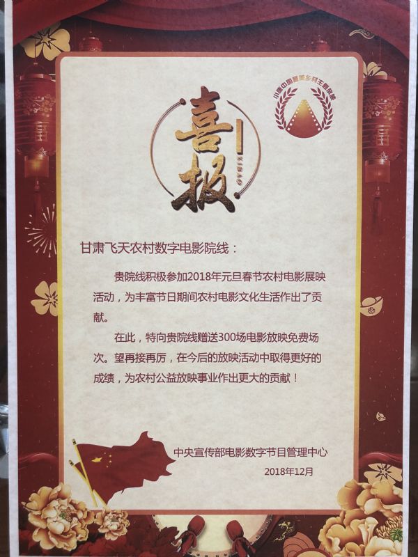喜 報(bào) 因我甘肅飛天農(nóng)村數(shù)字院線(xiàn)院線(xiàn)積極參加2018年元旦春節(jié)農(nóng)村電影展映活動(dòng),進(jìn)一步豐富了節(jié)日期間的鄉(xiāng)村文化生活,特此中央宣傳部電影數(shù)字節(jié)目管理中心向我院線(xiàn)贈(zèng)送300場(chǎng)電影放映免費(fèi)場(chǎng)次,鼓勵(lì)我院線(xiàn)在今后的放映活動(dòng)取得更好的成績(jī)。