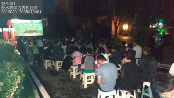 當(dāng)晚,放映員早早來(lái)到廣場(chǎng)上架設(shè)銀幕、調(diào)試設(shè)備。社區(qū)工作人員則忙碌的擺好板凳,不一會(huì)兒廣場(chǎng)上就人頭攢動(dòng),熱鬧起來(lái),觀眾們都想提前來(lái)?yè)寕(gè)好位置。到放映時(shí)間,廣場(chǎng)上坐滿了觀看影片的居民,氛圍其樂(lè)融融,電影在激昂的音樂(lè)聲中拉開(kāi)帷幕。