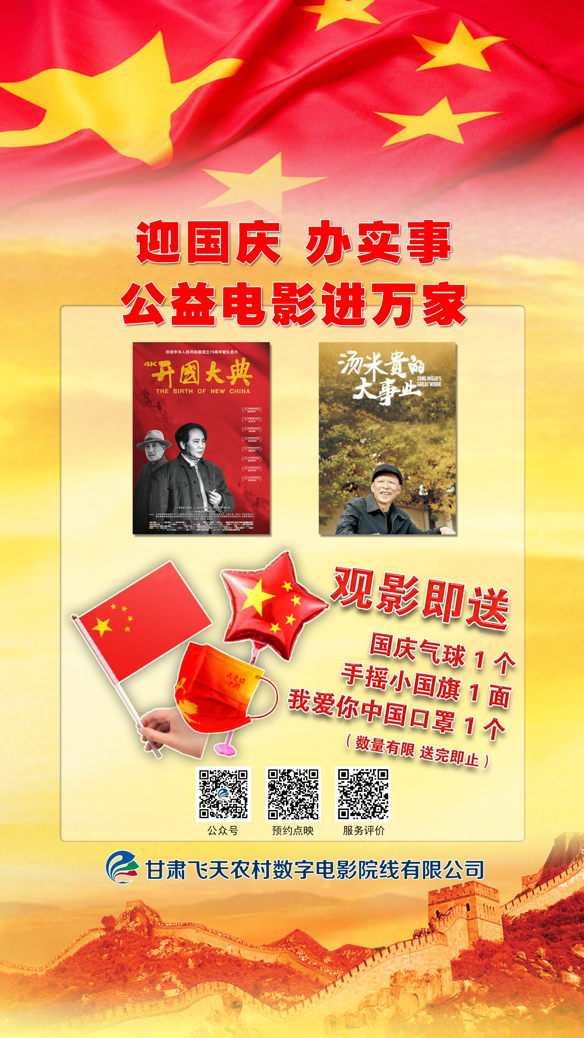 此外,為了保護觀影觀眾的身體健康,以及營造觀影現(xiàn)場氣氛,甘肅飛天農(nóng)村數(shù)字電影院線有限公司精心準備了一次性口罩和“國慶手搖紅旗”等小禮物,會在放映現(xiàn)場分發(fā)給廣大觀眾朋友。