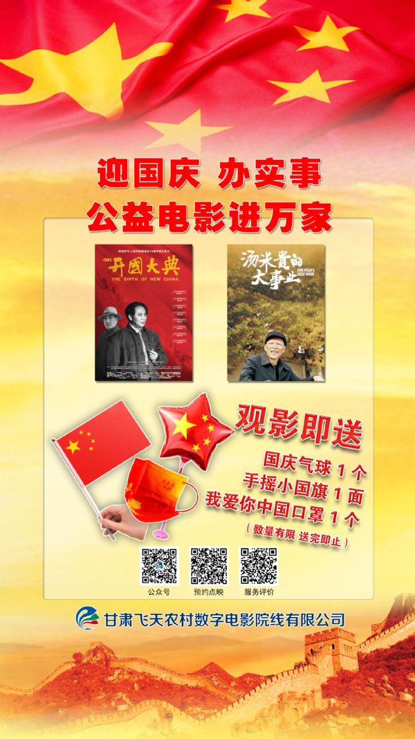 為了更好的營造節(jié)日氣氛,經(jīng)中共甘肅省委宣傳部統(tǒng)一部署,甘肅飛天農(nóng)村數(shù)字電影院線有限公司將在10月1日當天,在所管轄的6個市、區(qū)315個放映點同時放映電影《開國大典》、《湯米貴的大事業(yè)》。