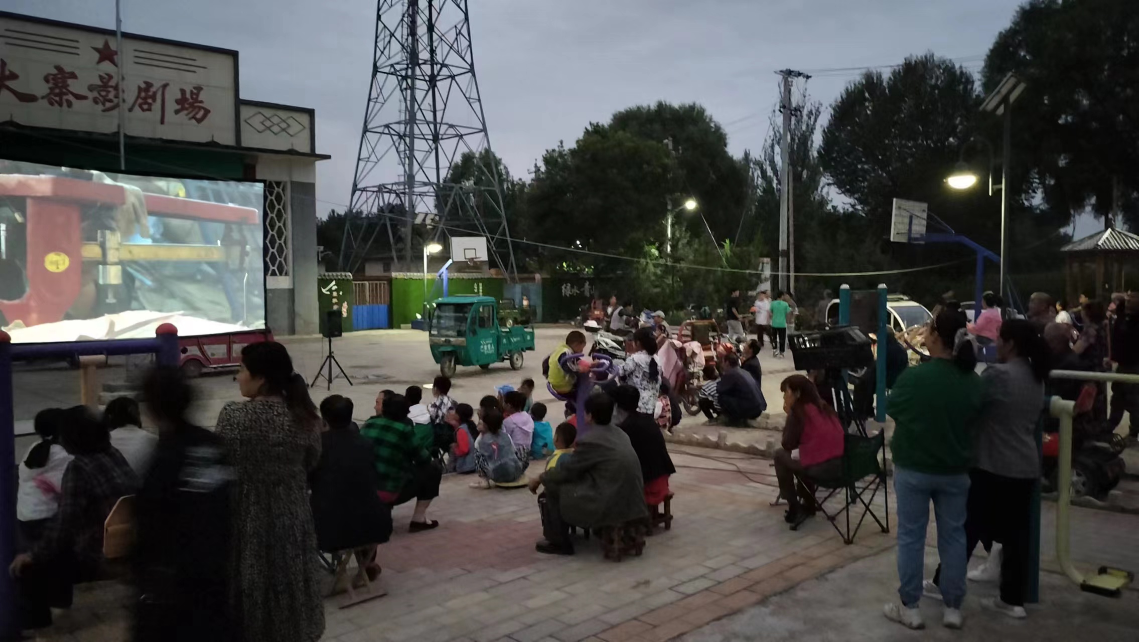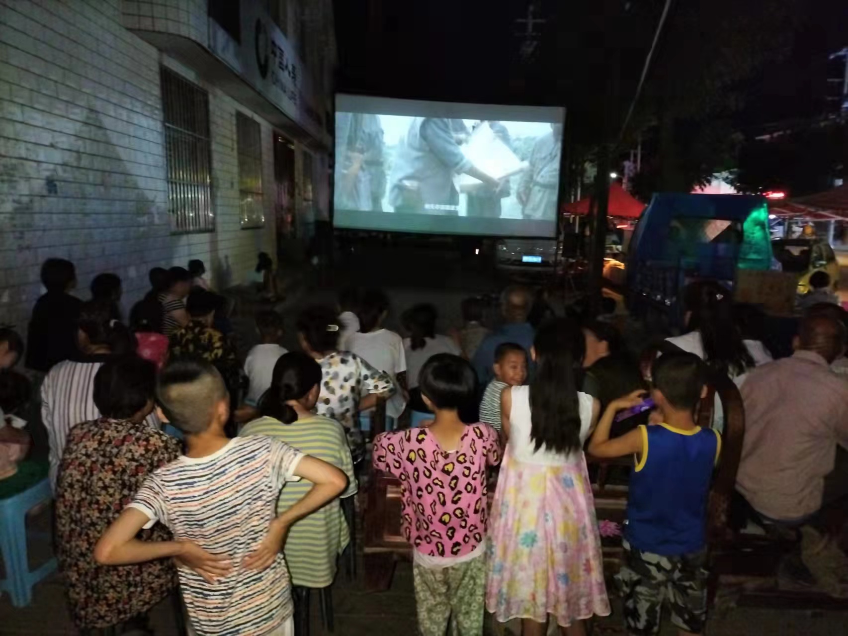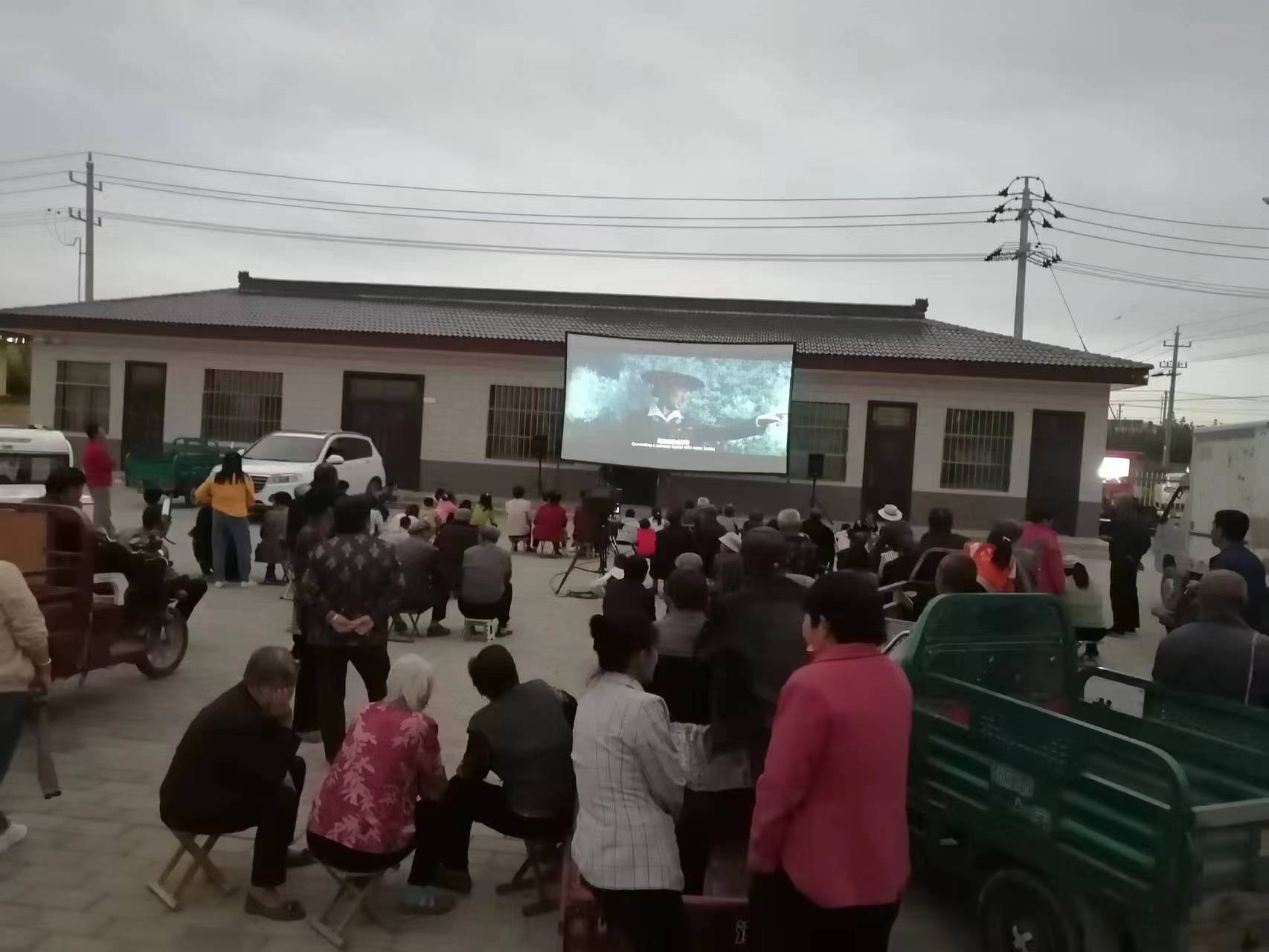 清爽秋日,觀眾的觀影熱情依然不減, 調(diào)音響、掛銀幕、擺凳子……放映員們動(dòng)作麻利,很快電影便開演了,村民們圍著銀幕,看得津津有味。