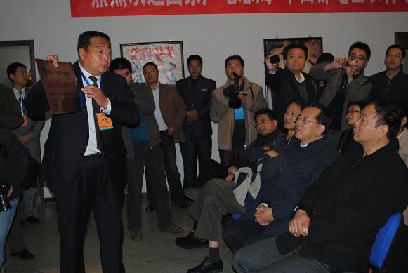董事長(zhǎng)趙捷向各位領(lǐng)導(dǎo)介紹農(nóng)村公益電影放映公示牌