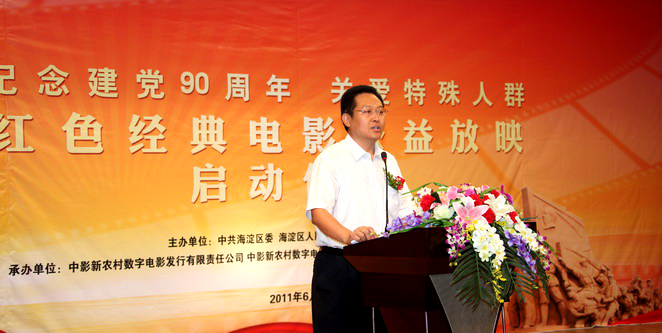 6月23日,“紀(jì)念建黨90周年•關(guān)愛特殊人群”——紅色經(jīng)典電影公益放映活動(dòng)啟動(dòng)儀式在北京四季青敬老院舉行。此次活動(dòng)由中影集團(tuán)、中共海淀區(qū)委、區(qū)人民政府聯(lián)合主辦,中影新農(nóng)村發(fā)行公司、中影新農(nóng)村放映有限責(zé)任公司與北京騰龍飛翔國(guó)際文化傳媒有限公司共同承辦。