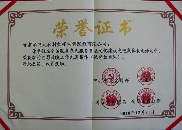 甘肅飛天院線榮獲農(nóng)村電影放映工作先進集體
