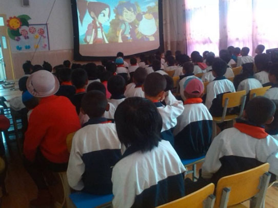 2016年6月1日下午,在甘肅飛天院線二分公司安排下,臨夏區(qū)放映員張耀杰在和政縣梁家寺小學(xué),為慶"六一"兒童節(jié)專場電影觀賞會活動放映公益電影,小朋友們興致勃勃的觀看國產(chǎn)經(jīng)典動畫片《樂樂熊奇幻追蹤》。