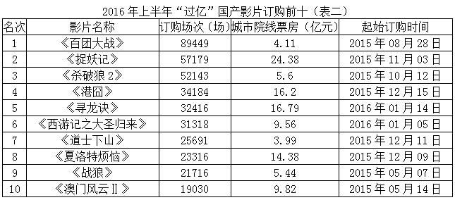 截至6月30日,數(shù)字電影服務(wù)交易平臺(tái)共有158部城市票房“過(guò)億”影片,其中2016年上半年新上“過(guò)億”影片23部;“過(guò)億”影片累計(jì)訂購(gòu)場(chǎng)次達(dá)656萬(wàn)8926場(chǎng),其中2016年上半年訂購(gòu)65萬(wàn)9402場(chǎng)。