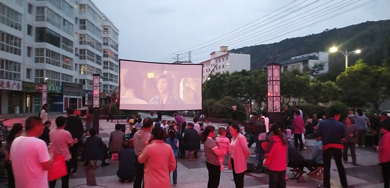 晚上6點(diǎn)多,吃過晚飯的居民們,考完試的學(xué)子們,三三兩兩端著小板凳,有說有笑地來到小區(qū)的廣場上等待電影放映。
